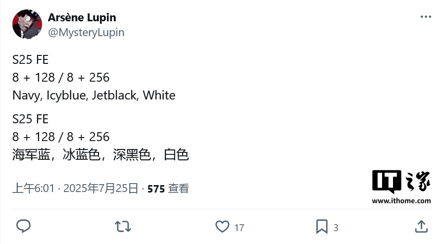 IT之家 7 月 25 日消息,消息源 @MysteryLupin 今天7 月 25 日)发布博文,曝料称三星 Galaxy S25 FE 手机依然采用 8GB 内存,有 128GB / 256GB